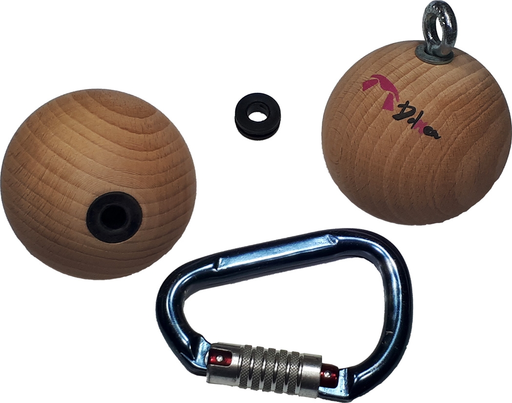 2 Bolas Madera 8cm Dolmen también pueden ser colgadas en el plafón para practicar salidas de techos y/o cambios de inclinación con desequilibrio, lo que aumentará el control de las famosas «bisagras o puertas».
