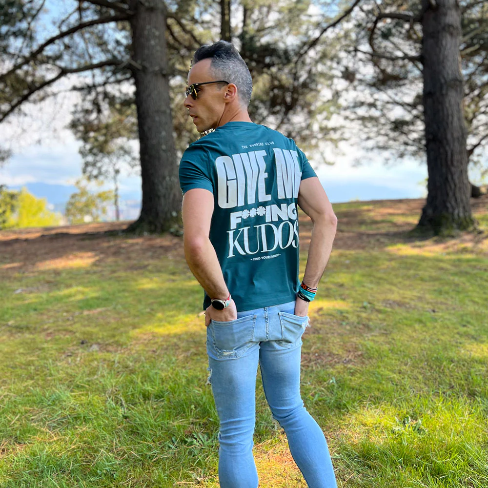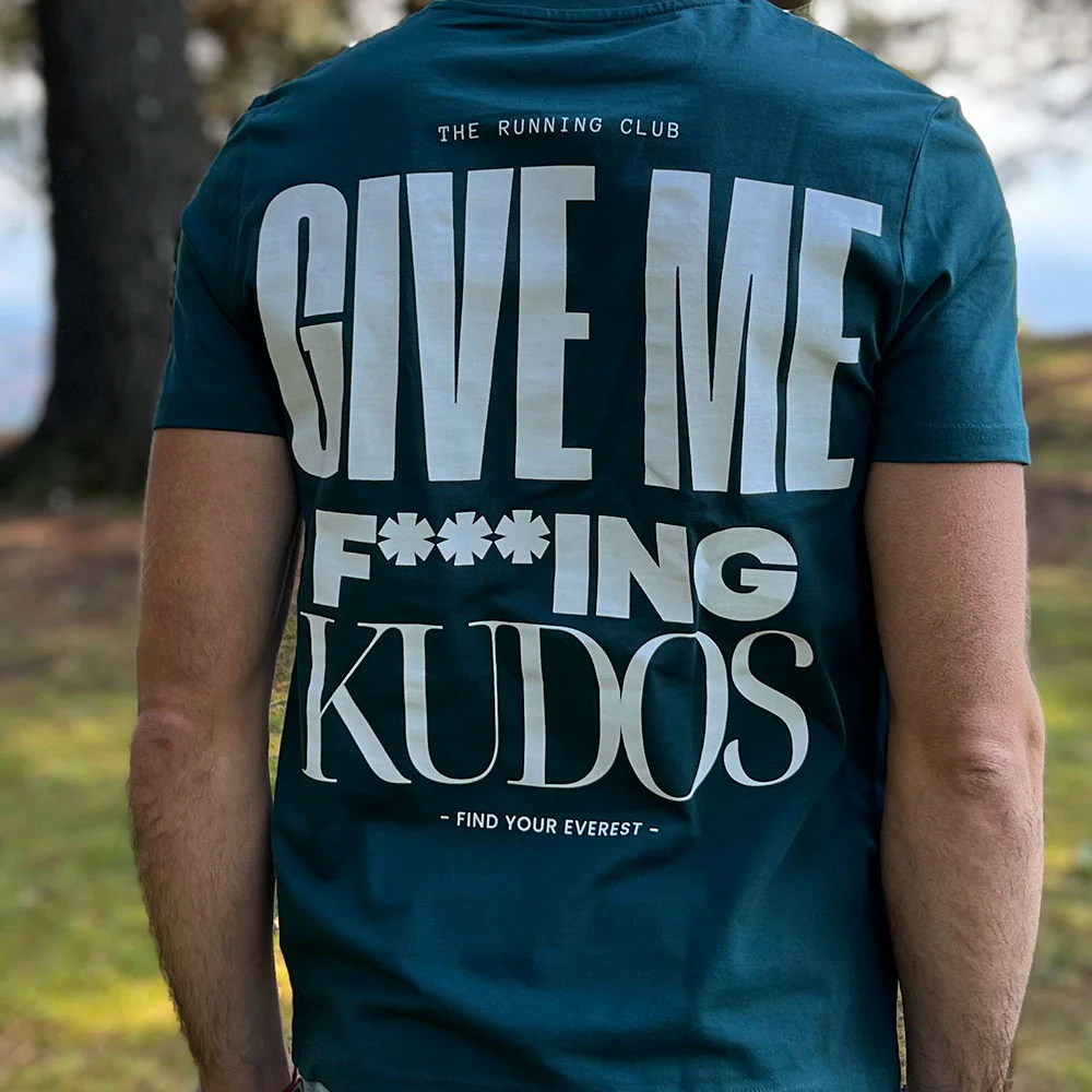 El diseño de la parte delantera incluye el logo The Running Club – Find Your Everest, mientras que en la parte trasera encontramos, alto y claro, el mensaje GIVE ME FUCKING KUDOS. Bueno, lo escribimos F***ING para que nadie se ofenda, pero se entiende claramente.