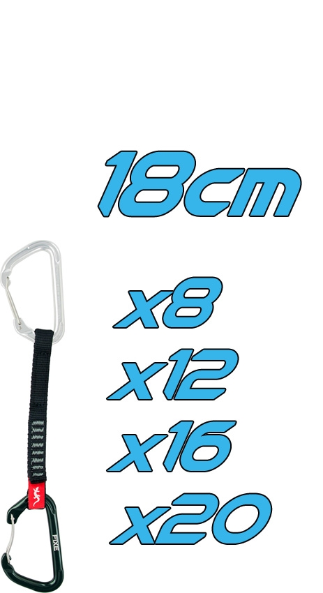 Las Cintas Express Rock 18cm Fixe vienen con mosquetones con sistema Clip, que los hace más ligeros y manejables. El mosquetón de la cuerda viene con sistema antigiro.