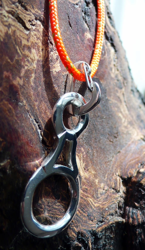 Colgante reproducción de un 8 de unos 3 cm y un mosquetón de 1 cm hecho en plata de ley y completamente artesanal.