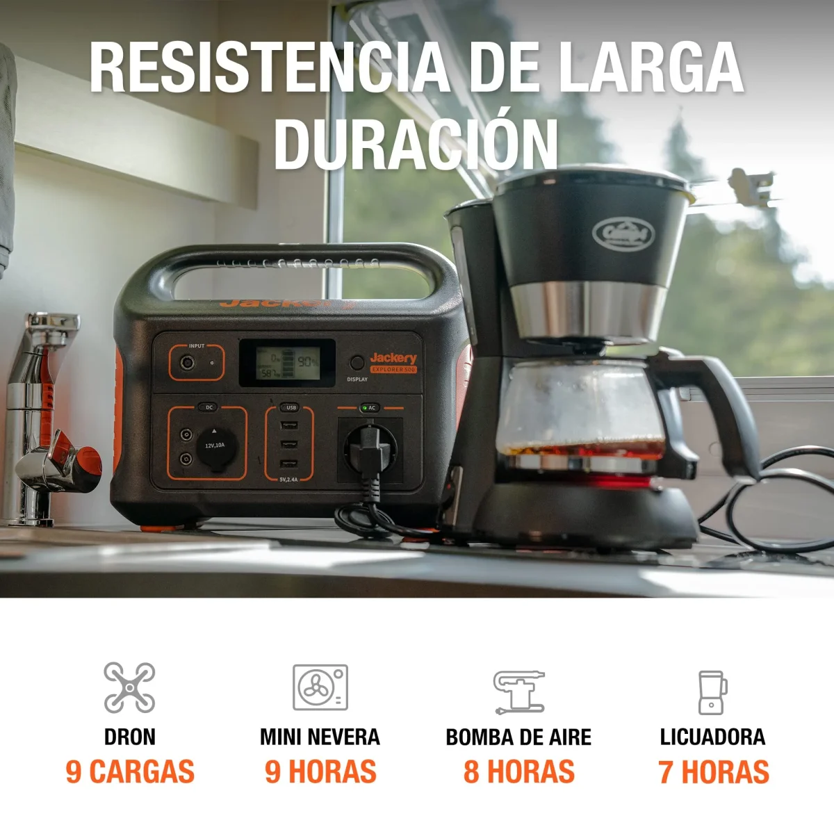 - Gran capacidad: El Jackery Explorer 500 tiene una batería de ion de litio 518 Wh (24 Ah, 21,6 V) y un inversor de onda sinusoidal pura. Cuenta con 1* salida de CA (230 V 500 W, 1000 W pico), 3* puertos USB-A, y 2* puertos de CC, 1* puerto de auto para dispositivos de baja y alta energía, como pequeños refrigeradores, bombas de aire, y televisores.