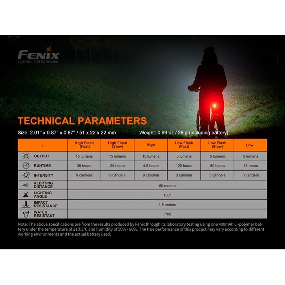 La versión mejorada de FENIX BC05R V2.0 LUZ ROJA TRASERA PARA RUNNING Y BICI es una luz trasera recargable ultracompacta con una llamativa luz roja diseñada para corredores y amantes de la bicicleta. Ser visto a lo lejos en el tráfico con una luz roja de 15 lúmenes y un ángulo de iluminación de 180° ayudará a que los viajes en bicicleta sean mucho más seguros y le brindarán tranquilidad en su viaje en bicicleta.