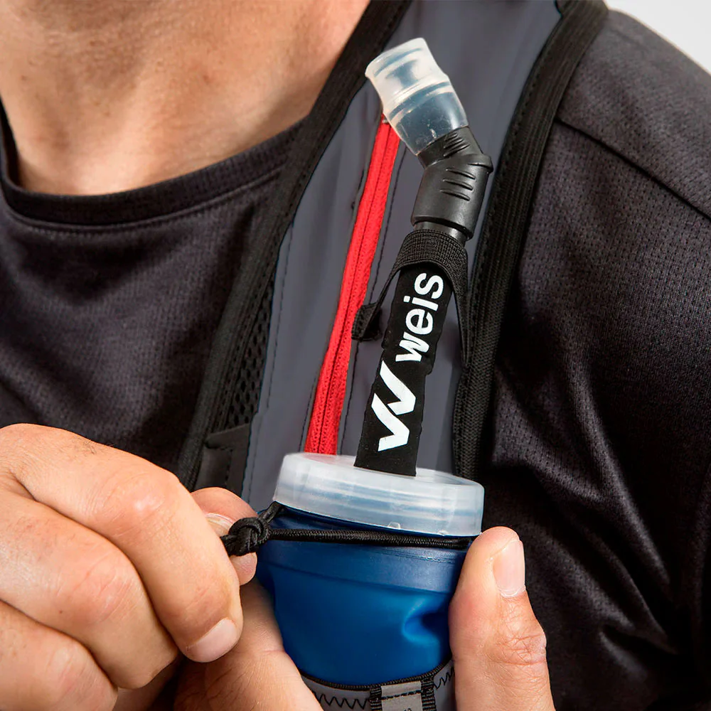 - 2 compartimentos frontales con enganches para botellas blandas tipo soft flask (recomendada) o botellas rígidas de hasta 750 ML.