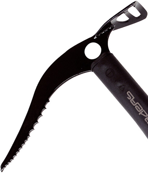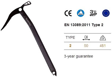 El mango, de aleación ligera, viene levemente curvado al nivel de la cabeza lo que facilita su uso como piolet de tracción. A su vez, el mago está cubierto completamente con goma para un mejor agarre y cierta protección contra el frío.