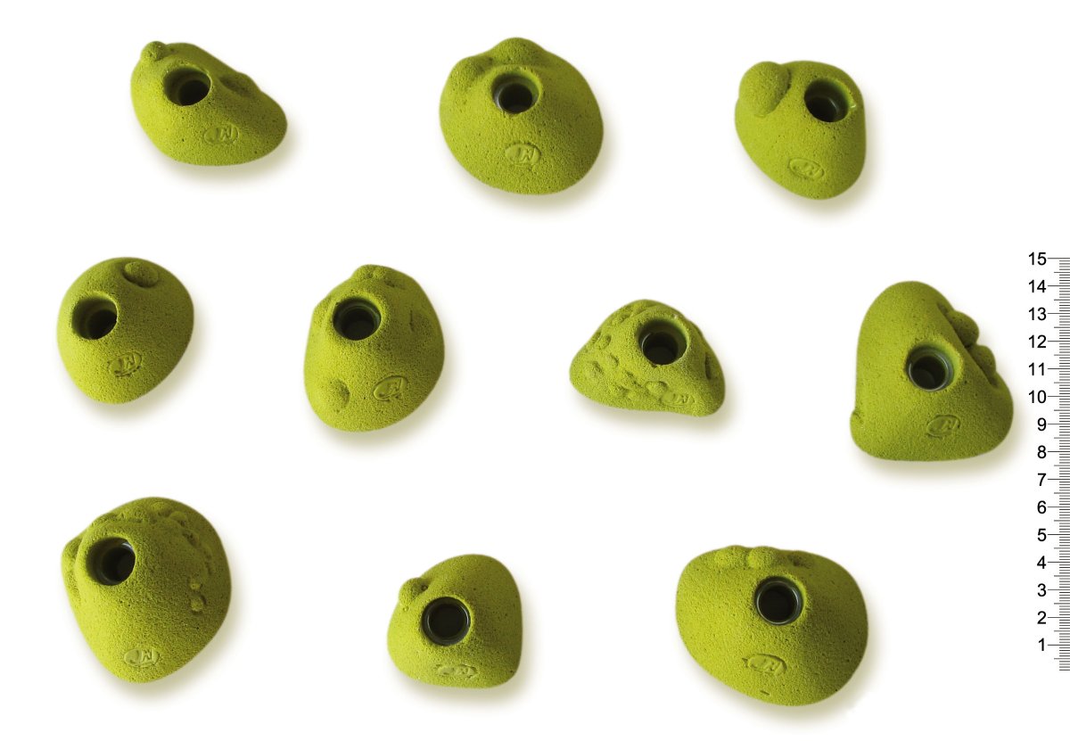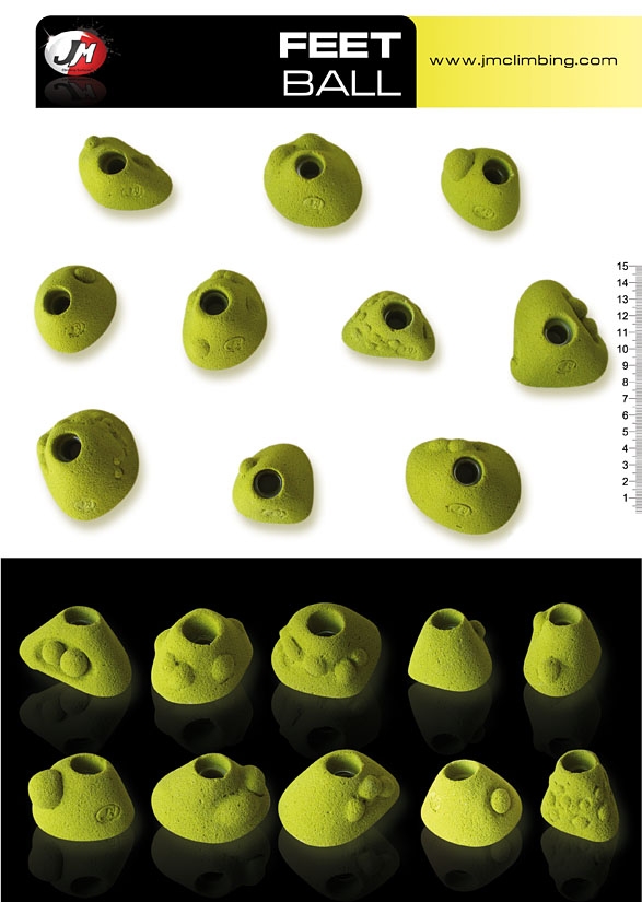 Presas Feet Ball Set es una colección de JM Climbing que cuenta con 10 unidades de tamaño pequeño, ideal para combinar con cualquier tipo de problema de Boulder.