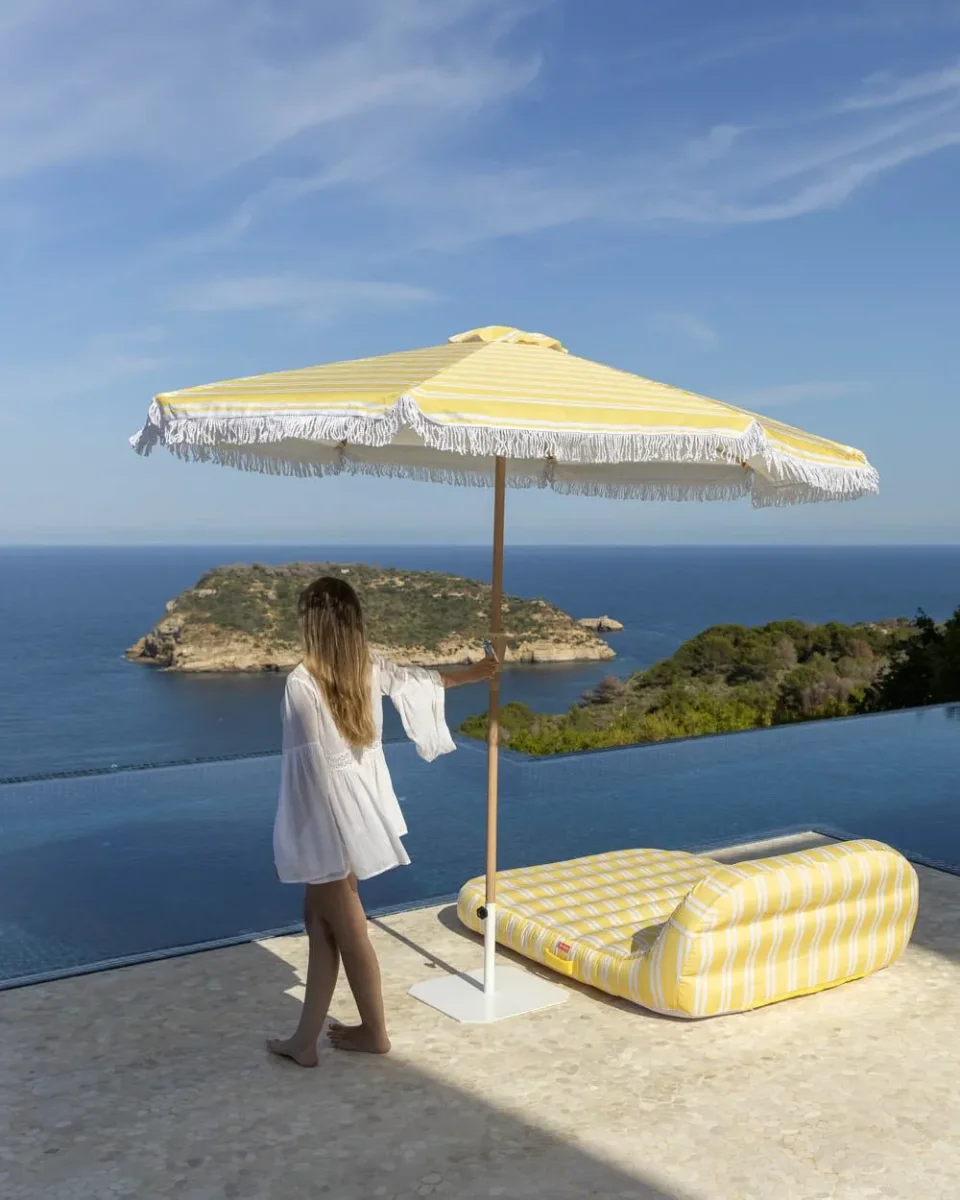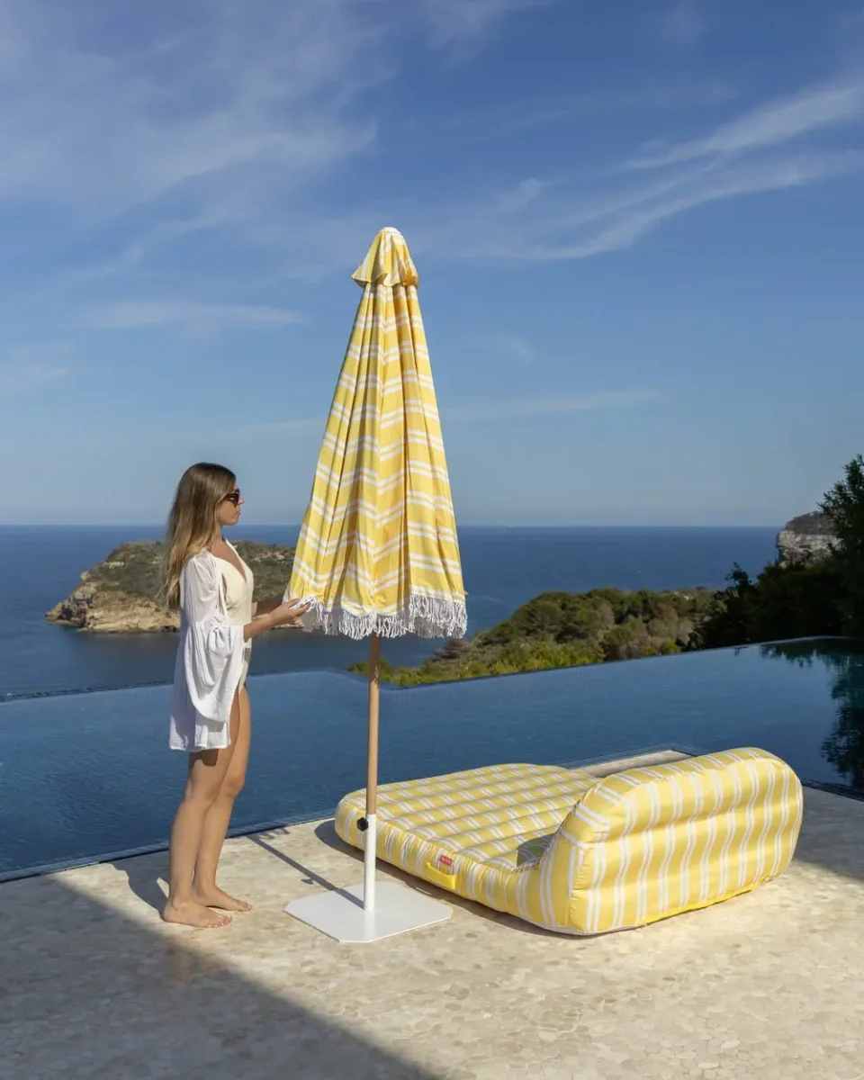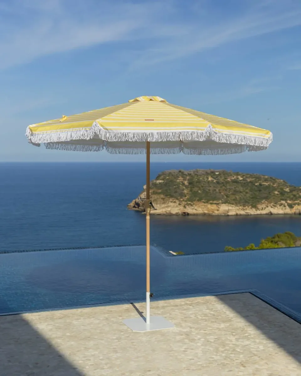 Nuestra sombrilla grande a rayas amarilla es el accesorio perfecto de la temporada. Con orientación regulable y apertura anti viento. además de UPF 50+. Perfecta para tenerla en el jardín o en tu terraza.