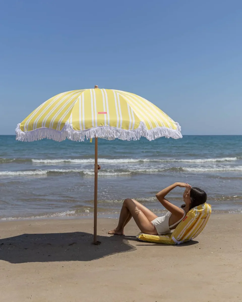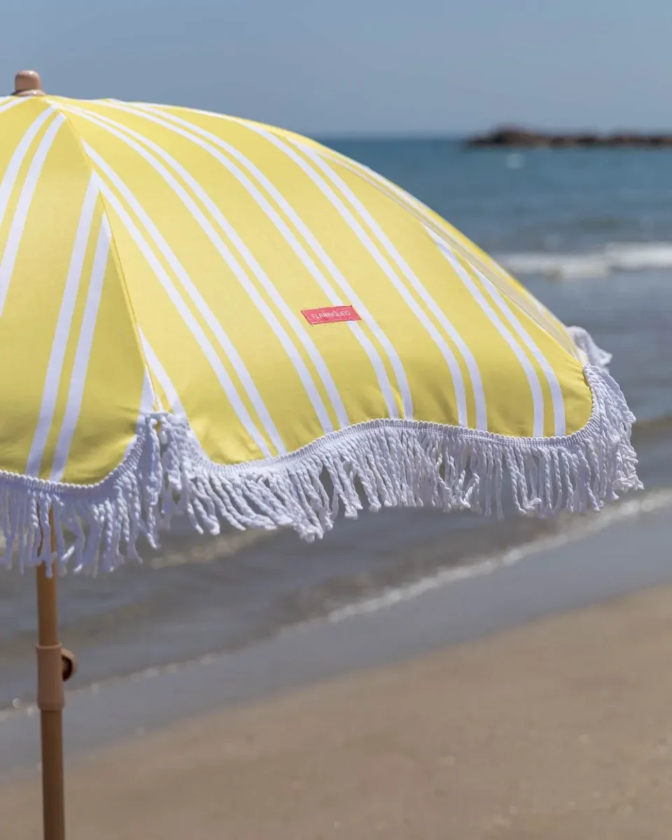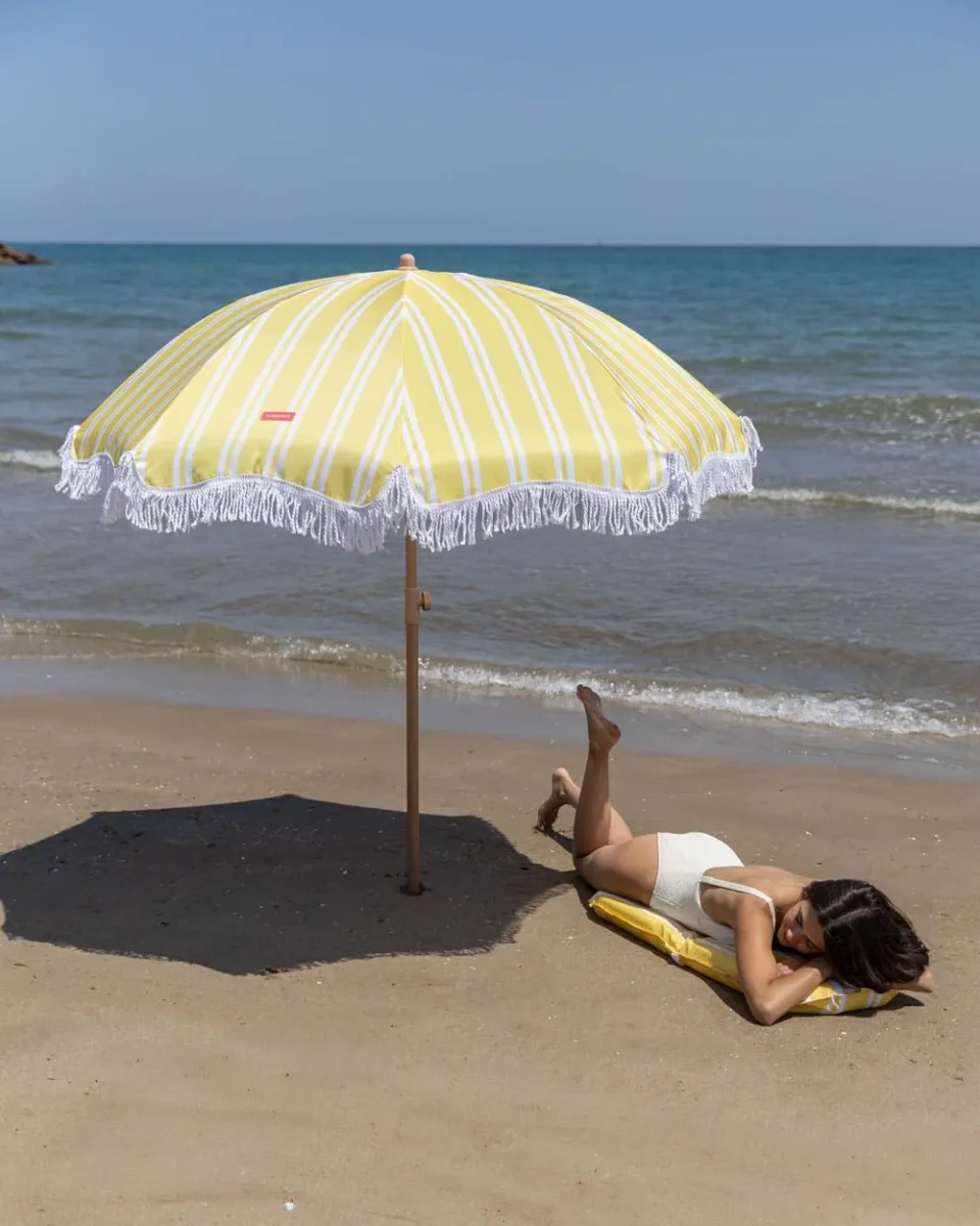 Nuestra sombrilla a rayas amarilla es el accesorio perfecto de la temporada. Con altura y orientación regulable. además de UPF 50+. Perfecta para tenerla en el jardín o llevártela a la playa junto con su bolsa de transporte a juego.