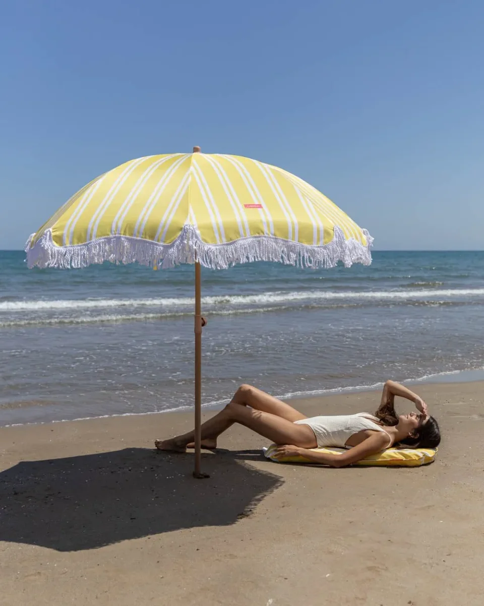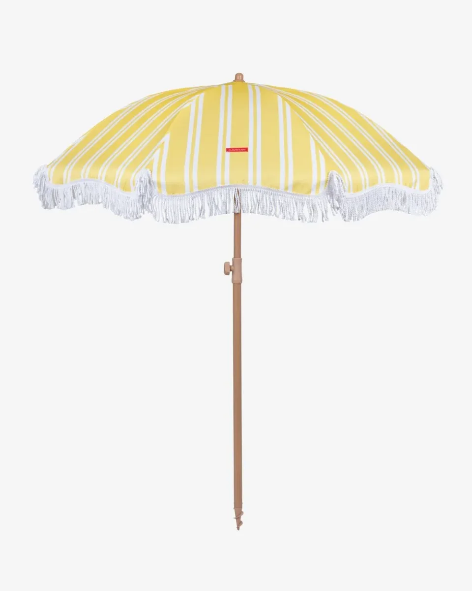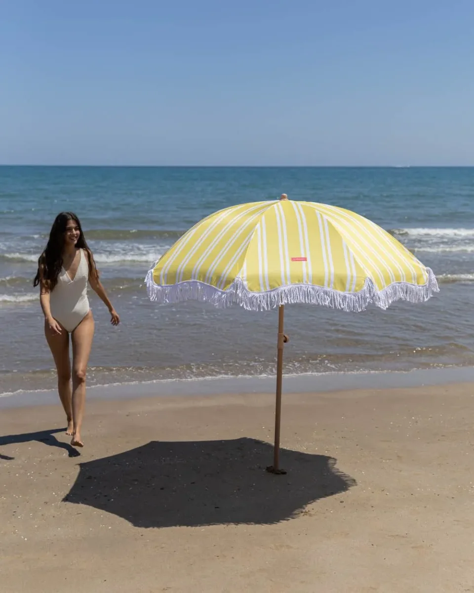 Nuestra sombrilla a rayas amarilla es el accesorio perfecto de la temporada. Con altura y orientación regulable. además de UPF 50+. Perfecta para tenerla en el jardín o llevártela a la playa junto con su bolsa de transporte a juego.