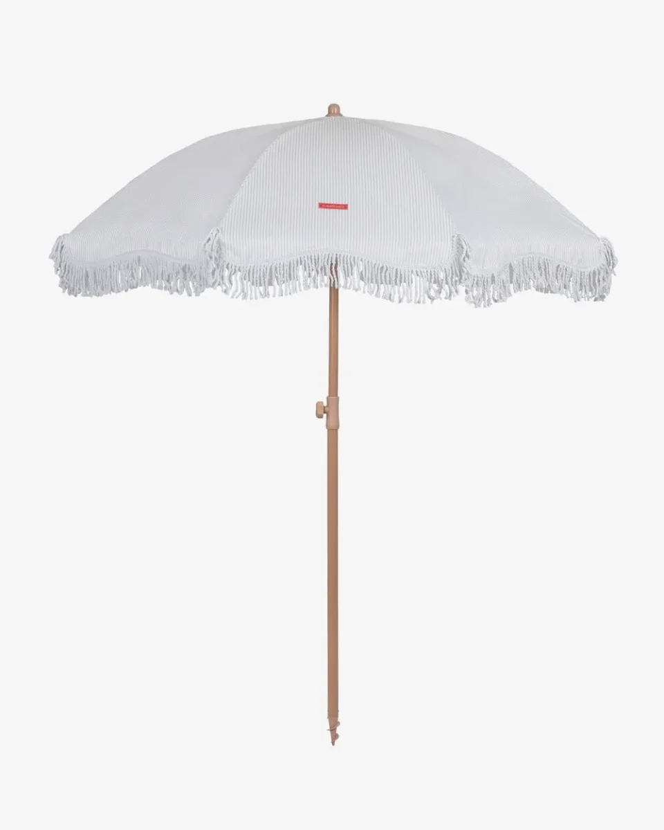 Nuestra sombrilla de rayas finas color beige es el accesorio perfecto de la temporada. Con altura y orientación regulable. además de UPF 50+. Perfecta para tenerla en el jardín o llevártela a la playa junto con su bolsa de transporte a juego.