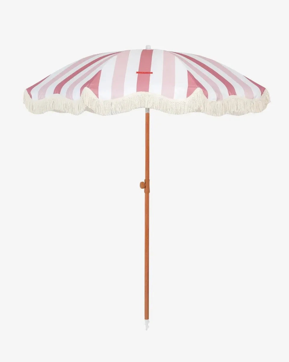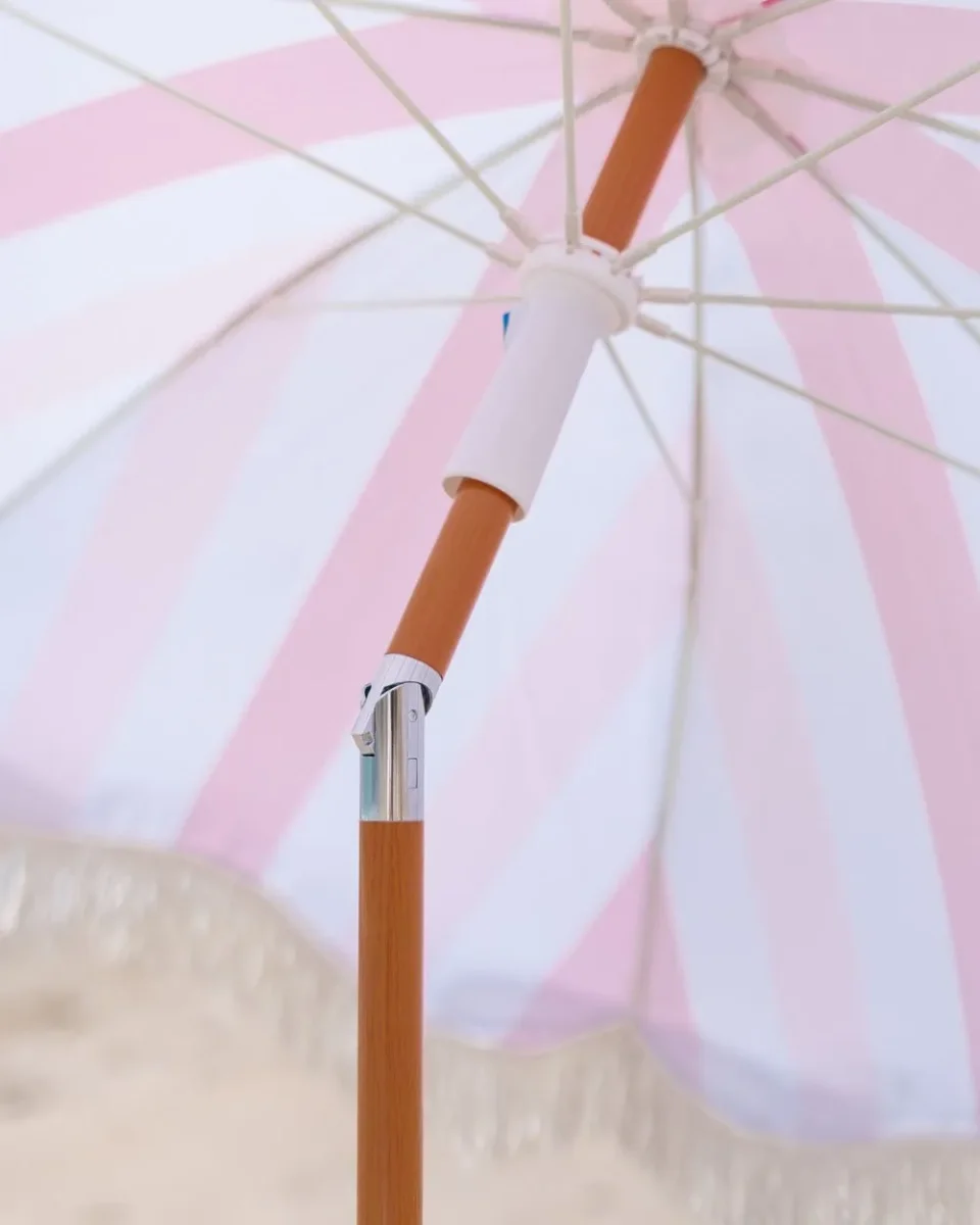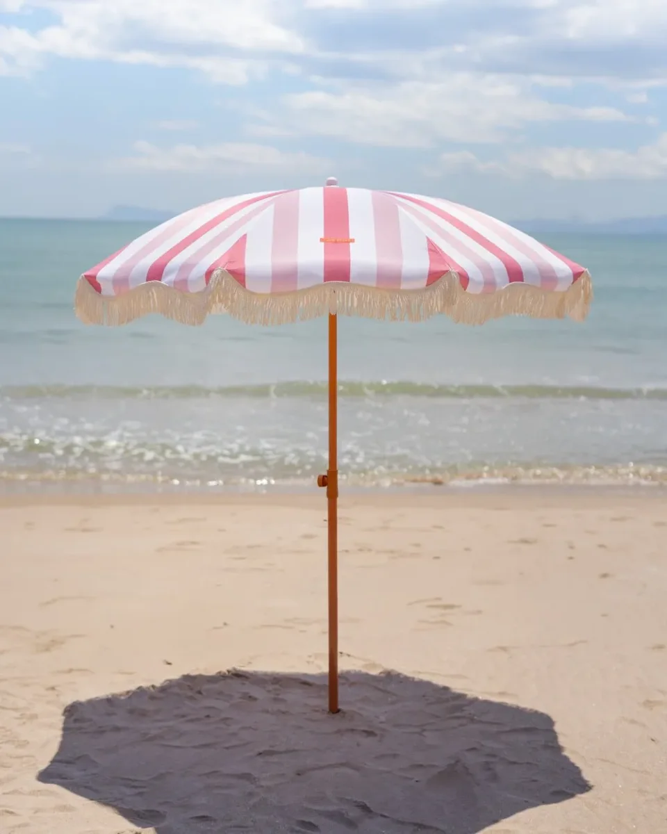 Nuestra sombrilla de rayas finas rosa es el accesorio perfecto de la temporada. Con bolsa de transporte a juego y altura y posición ajustable. Perfecta para playa o jardín con UPF 50+.