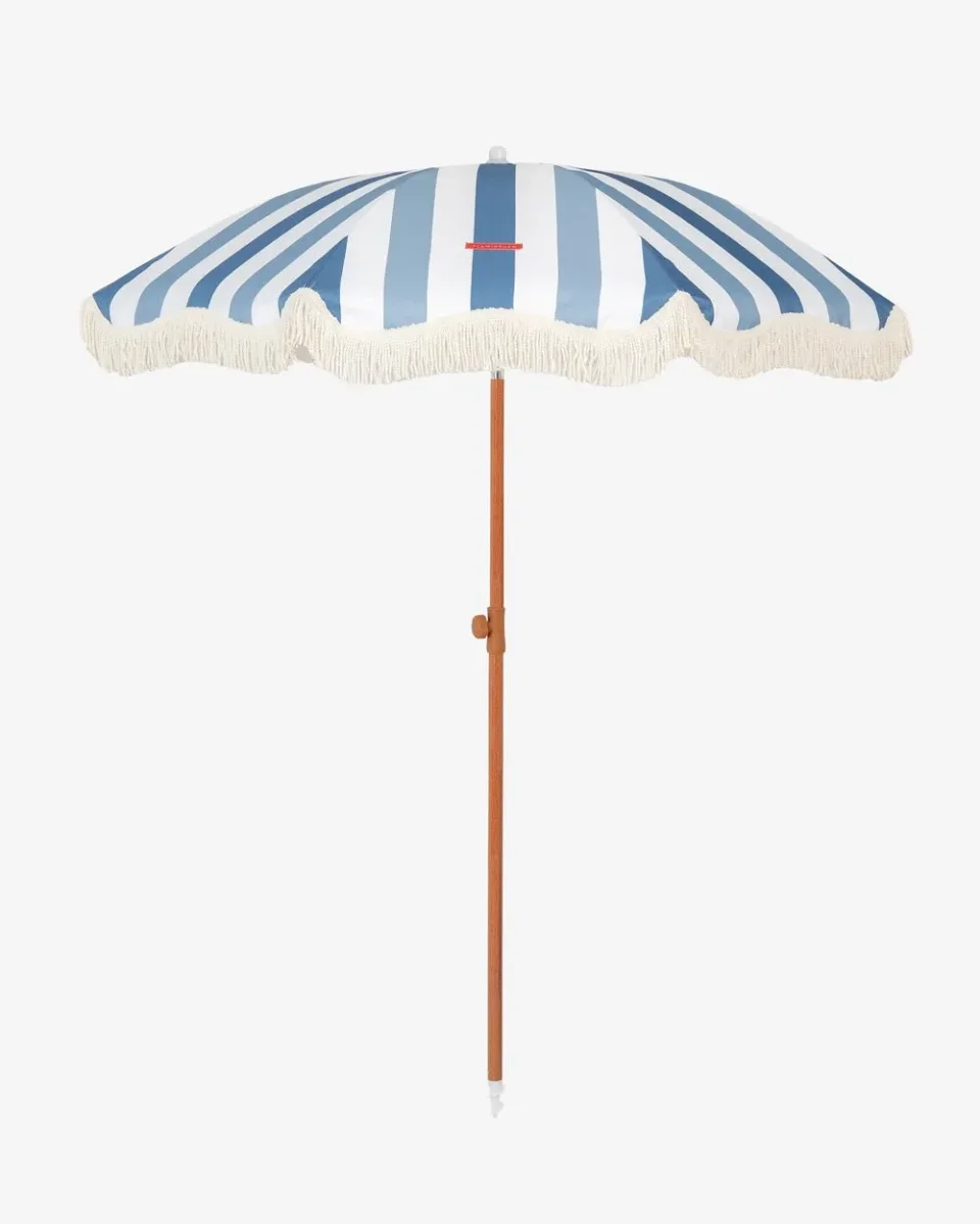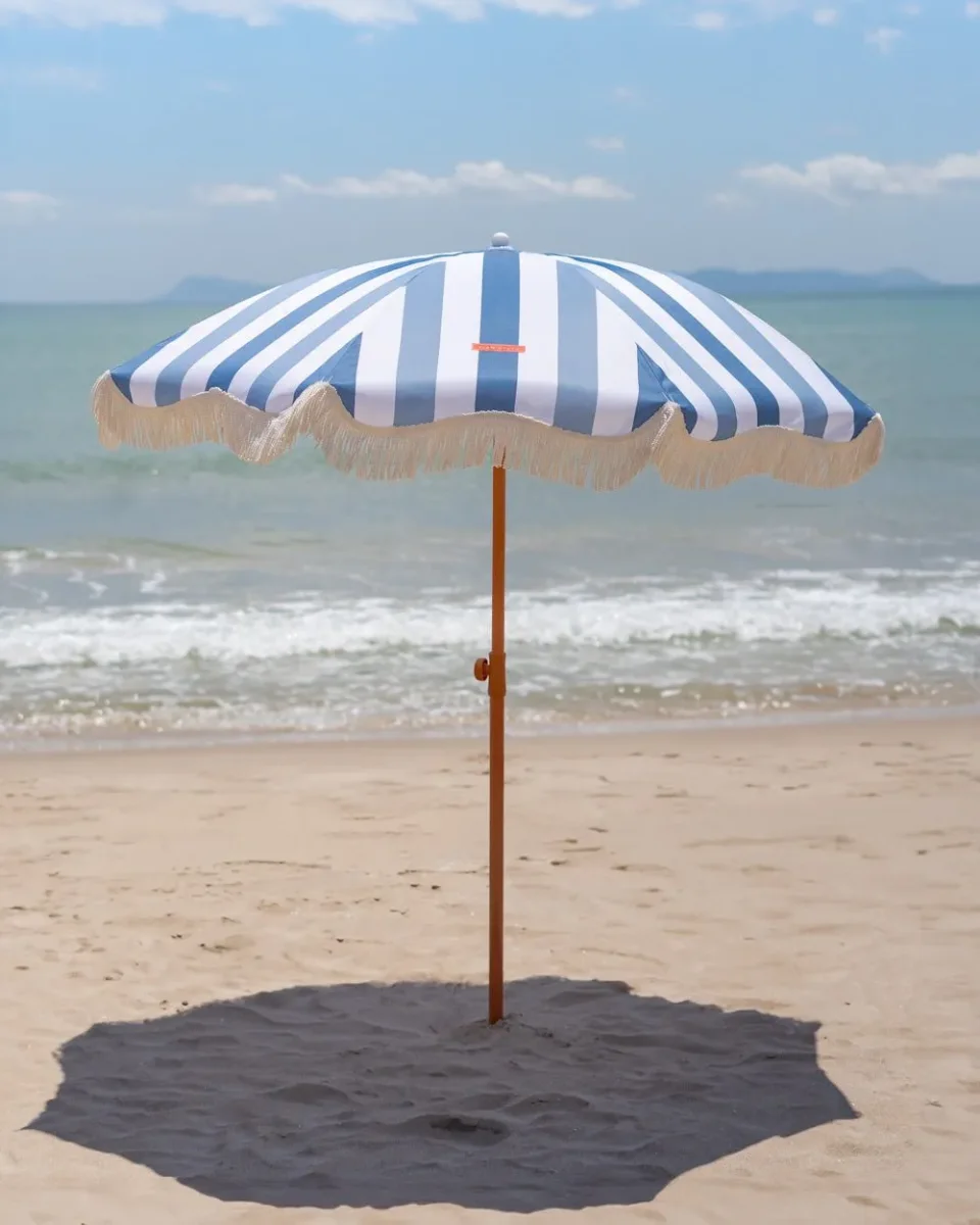 Nuestra sombrilla de rayas finas azul es el accesorio perfecto de la temporada. Con bolsa de transporte a juego y altura y posición ajustable. Perfecta para playa o jardín con UPF 50+.
