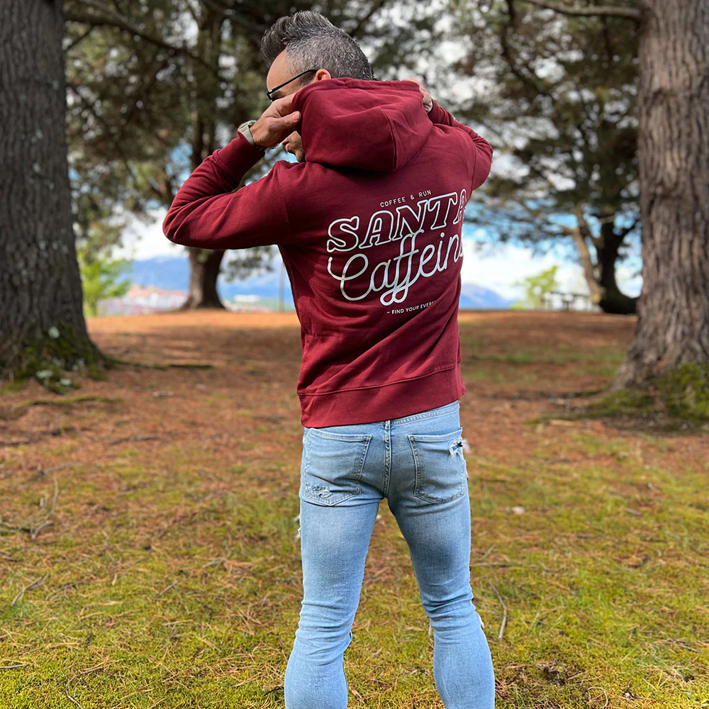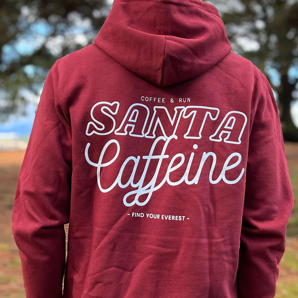 El diseño de la parte delantera incluye el logo The Running Club – Find Your Everest de forma discreta y elegante, mientras que en la parte trasera encontramos, de forma bien visible SANTA CAFFEINE. ¡Gracias por estar ahí en los momentos más duros!