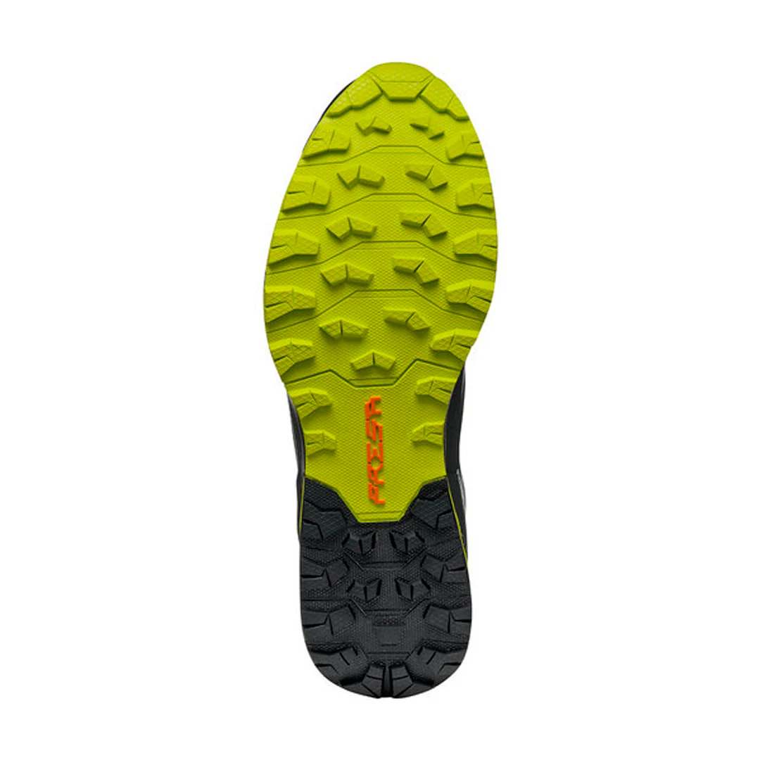 Scarpa incluye en este modelo su compuesto PRESA® TRN-01, con unos tacos de 4mm y una disposición tal, que aporta un agarre buenísimo a una zapatilla claramente pensada para correr por terreno técnico. Esto no quiere decir que no la podamos meter por zonas más sencillas, que también iremos cómodos, pero donde realmente le sacaremos partido es si solemos correr por terrenos complejos.