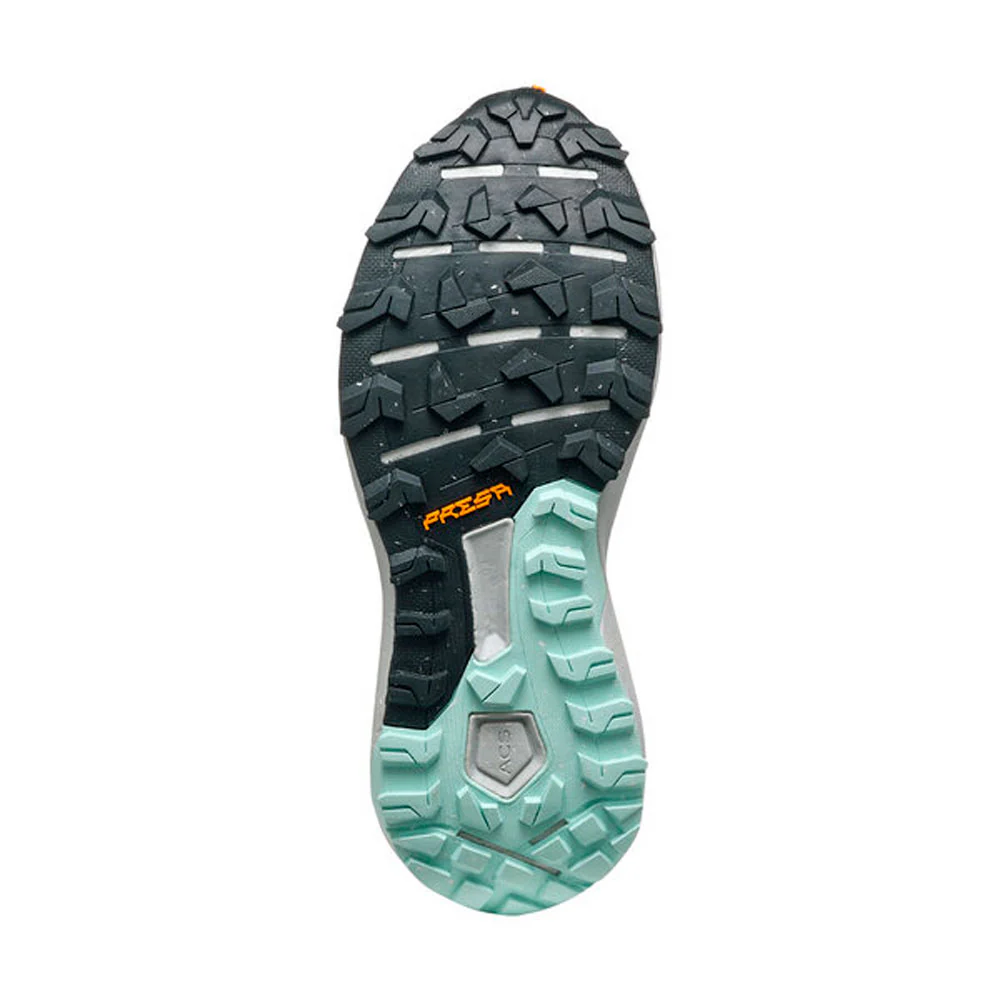 Como es habitual en la marca, cuenta con un compuesto propio para la suela, como es el PRESA® TRN-06, en este caso con un 30% de materiales reciclados. Los tacos no tienen un agarre excesivo, lo justo para tener tracción en terrenos sencillos, que es donde mejor se desenvuelve. Así que nada de meterla por sitios muy complicados donde se necesite mucho agarre y tracción.